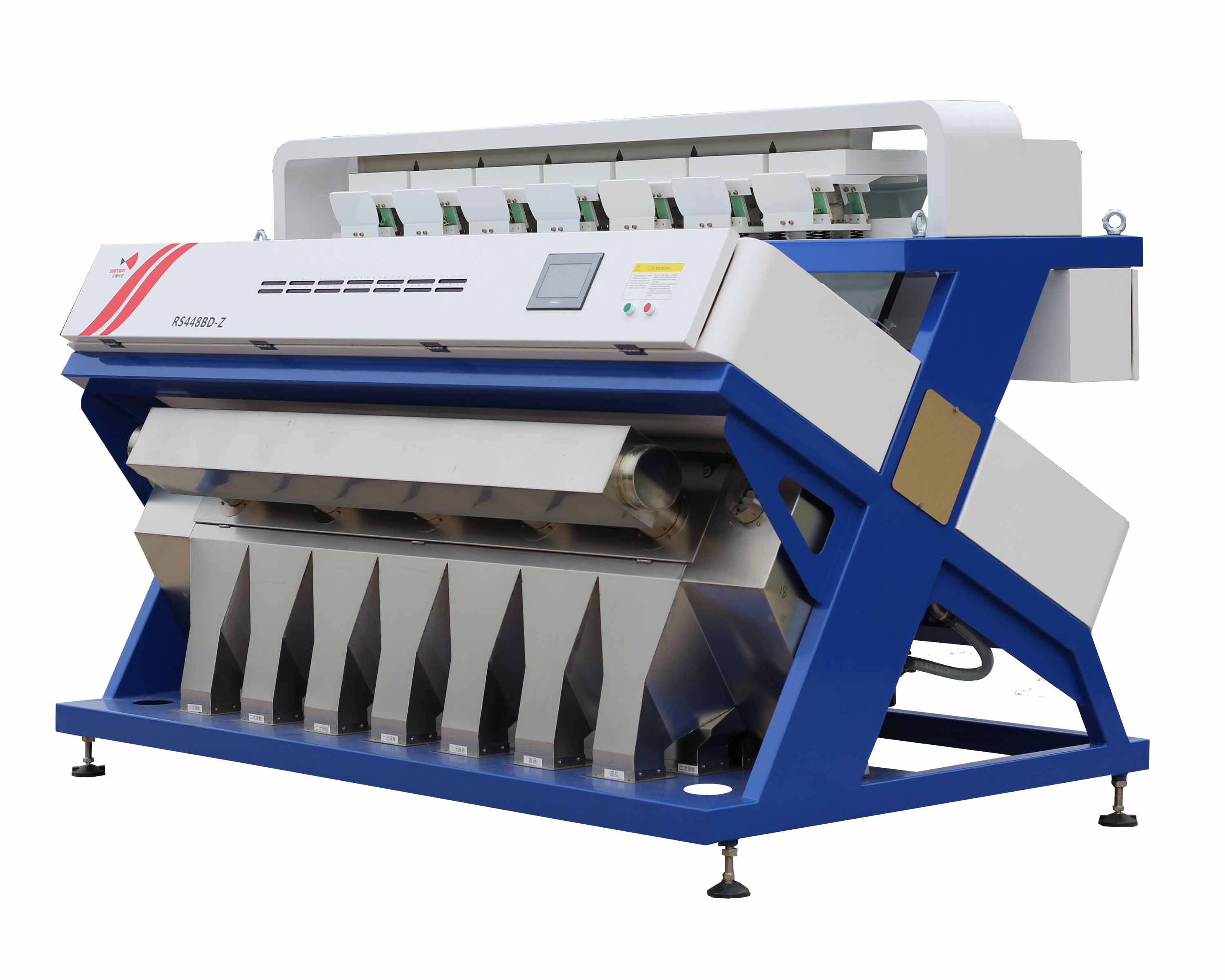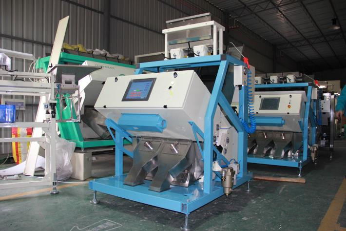 色選機又稱光電色選機,是集光、電、氣、機于一體的高科技產品。是利用光電原理從大量散裝產品中將顏色不正常的或感受病蟲害的個體(球、塊或顆粒)以及外來夾雜物檢出并分離的單元操作,色選所使用的設備即為色選機。在不合格產品與合格產品因粒度十分接近而無法使用篩選設備分離或密度基本相同無法使用比重分選設備分離時,色選機能進行有效地分離,其獨特作用十分明顯,是分離密度基本相同、精度完全相同物料的佳設備。處裝有高穩(wěn)定光源,當物料經由振動喂料系統(tǒng)均勻地通過斜槽通道進入選別區(qū)域時,光電傳感器測得反射光和投射的光量,并與基準色板反射光量比較,將其差值信號放大處理,當信號大于預定值時,驅動噴射系統(tǒng)用壓縮空氣吹出異色粒子,從而達到色選的目的。